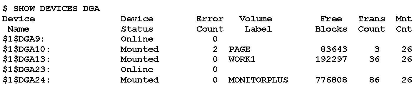 OpenVMS mass storage performance was once a matter of looking at FILES-11 volumes, available space, and activity. The DCL SHOW DEVICE command displayed gross available space, Figure 1. MONITOR[2] displayed second-to-second activity. T4[3] invokes MONITOR/RECORD from within submitted batch jobs to gather statistics over extended time periods for later analysis and graphing.